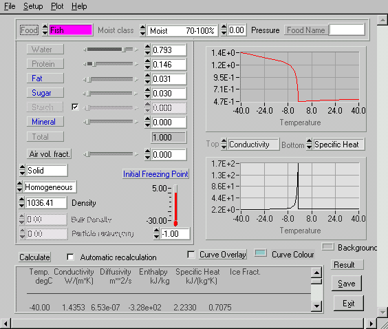 COSTHERM predicts the thermal properties of foods (thermal conductivity, specific heat capacity, freezing point, ice fraction) from the given chemical composition of the food.